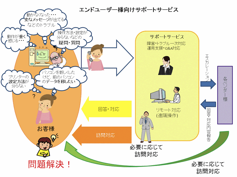 サポートサービスの詳しい内容や連絡先およびリモートサポート用ツールのインストールと設定方法についての資料を郵送(メール添付)いたします。